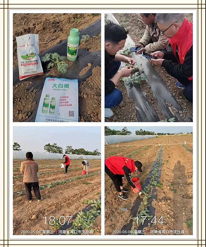 5月6日,谢氏农化技术人员来到河南周口沈丘,经实地调查发现,当地西瓜僵苗十分严重,植株发棵慢,甚至不再生长。谢氏农化技术人员耐心讲解西瓜的疑难杂症,及时帮助农户用药灌根防治。