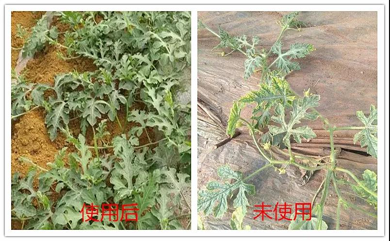 5月27日,回访实验田发现:使用过产品的西瓜田,西瓜长势喜人,有效缓解死苗、僵苗的发生。