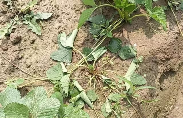 草莓青枯病发病初期叶柄变为紫红色。植株发育不良,随着病情加重,部分叶片突然失水,不变色而萎焉,逐渐枯萎死亡。切断根茎部可见导管变成褐色,挤压有乳白色液渗出。