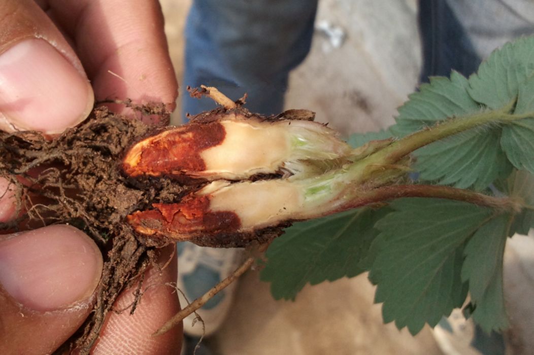 草莓红中柱根腐病在地温低、湿度高易发病,病菌从根的顶端侵入后,向根心发展,使中柱变为红褐色,这是该病最明显的特征。严重时根变为黑褐色而腐烂。地上部先由基部叶的边缘开始变为红褐色,再逐渐向上凋萎枯死,病株容易拔起。将根颈横切,中柱部位可见针点样褐变。