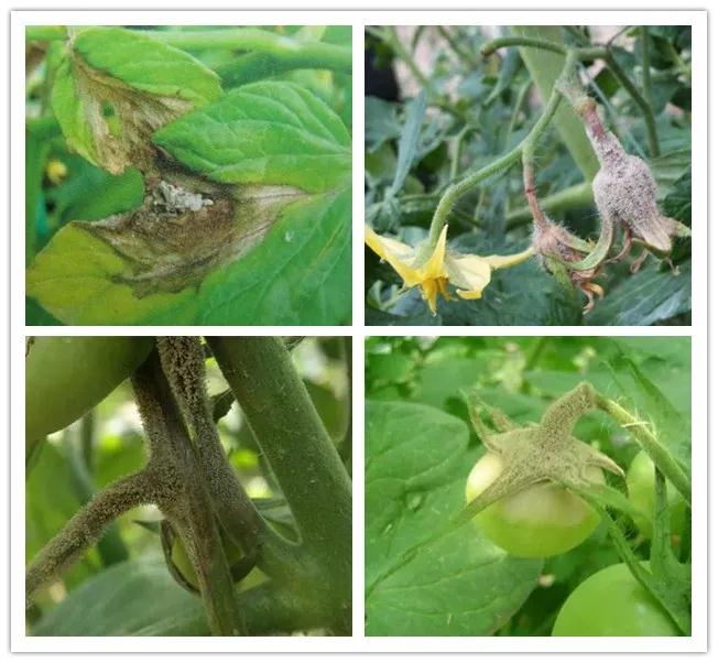 灰霉病对番茄叶、茎、花、果实均形成侵染,但以为害青果较为严重。