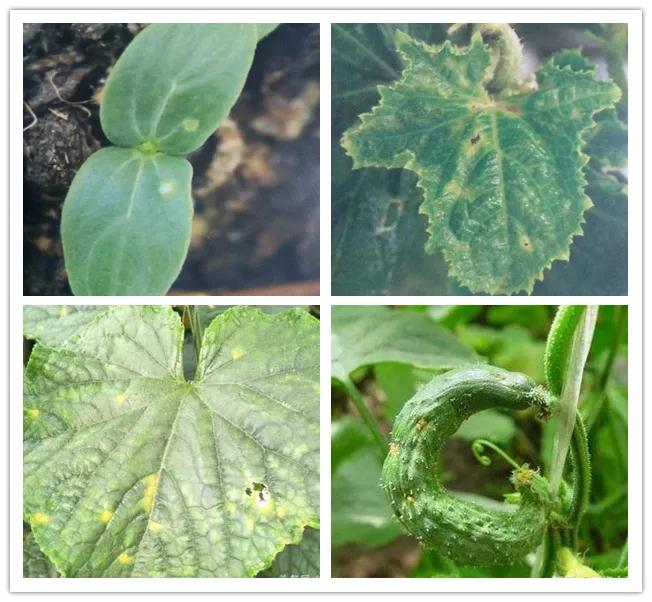 黑星病在黄瓜的整个生育期均可侵染发病,可危害黄瓜的叶片、茎、卷须、瓜条及生长点,以植株的嫩叶、嫩茎和幼果受害最重。