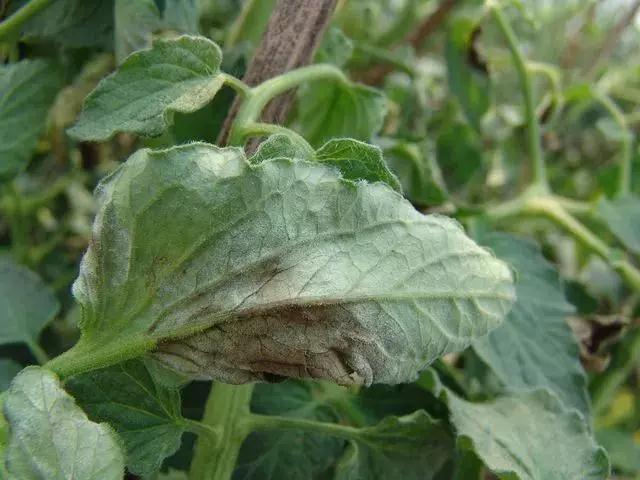 多从叶柄或叶缘处形成水渍状不规则病斑,湿度大时,可见白色霉层。